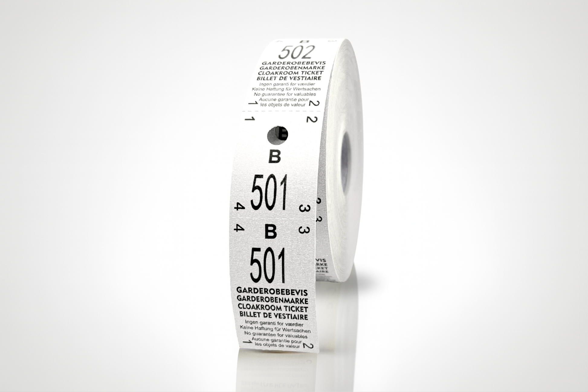 Jokainen lippu koostuu kahdesta osasta, joilla on sama numero, joten sekä vieraat että henkilökunta voivat helposti pitää kirjaa päällysvaatteistaan. Toimitetaan 500 kappaleen sarjoissa - käyttövalmiita.